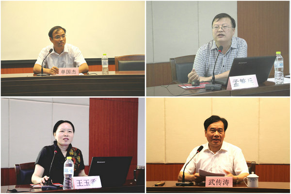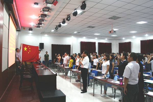 开班仪式上,全体新聘教职工在老教师代表武传涛教授带领下,面向国旗,庄严宣誓。宣誓仪式后武传涛教授从“爱校融校、敬业乐业、尊师爱生” 三个方面与新教师分享了自己从教30多年的为师心得。