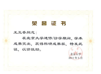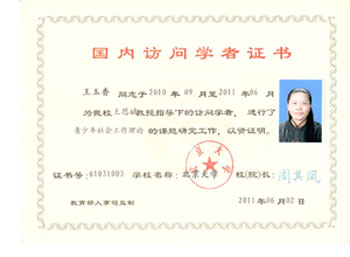 按照“山东省高等学校优秀青年教师国内访问学者项目”的要求,王玉香教授于2010年9月到北京大学社会学系开始了为期一年的访学,师从我国著名社会学家、社会工作学家王思斌教授进行青少年社会工作理论等研究工作。在访学期间,王玉香教授主动向导师请教,充分利用北大优质的教学与科研资源,积极开展科学研究,一年中累计发表科研论文三篇,其中一篇被CSSCI收录,受到了导师与同行学者的充分肯定与高度评价。同时在访学期间,王玉香教授认真履行班长职责,积极配合北大继续教育部领导的工作,主动热情地为访问学者与进修教师服务,受到了一致好评。