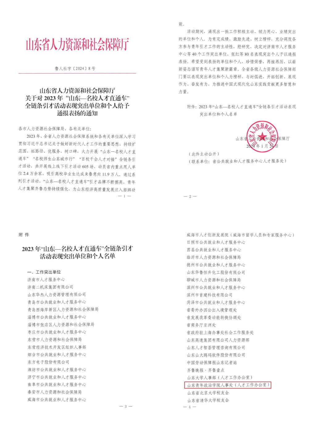 近日,山东省人力资源和社会保障厅下发了《关于对2023年“山东—名校人才直通车”全链条引才活动表现突出单位和个人给予通报表扬的通知》,我校人事处获评工作表现突出单位。